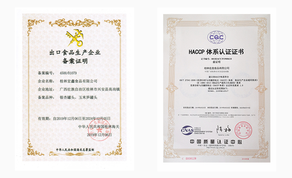 桂林宏鑫食品有限公司通過出口食品生產企業備案,獲得HACCP體系認證,具備進口貿易資質。銀杏罐頭大量出口至日本、中國臺灣、香港、新加坡、泰國、澳洲等,是全球規模大的銀杏罐頭加工廠。